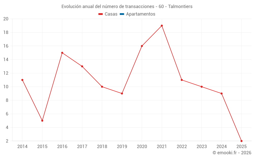 El precio mediano en las 17 transacciones de casas de los últimos 24 meses en la comuna de Talmontiers fue de 2 123 € por metro cuadrado para un valor patrimonial medio de 190 000 €. Durante este período el 60% de las transacciones estuvieron entre 1 841 y 2 500 € por metro cuadrado (del 2º al 8º decil).