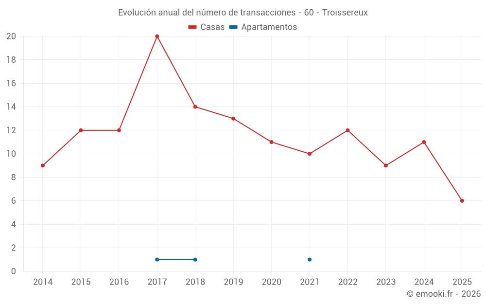 El precio mediano en las 24 transacciones de casas de los últimos 24 meses en la comuna de Troissereux fue de 2 104 € por metro cuadrado para un valor patrimonial medio de 196 925 €. Durante este período el 60% de las transacciones estuvieron entre 1 690 y 2 475 € por metro cuadrado (del 2º al 8º decil).