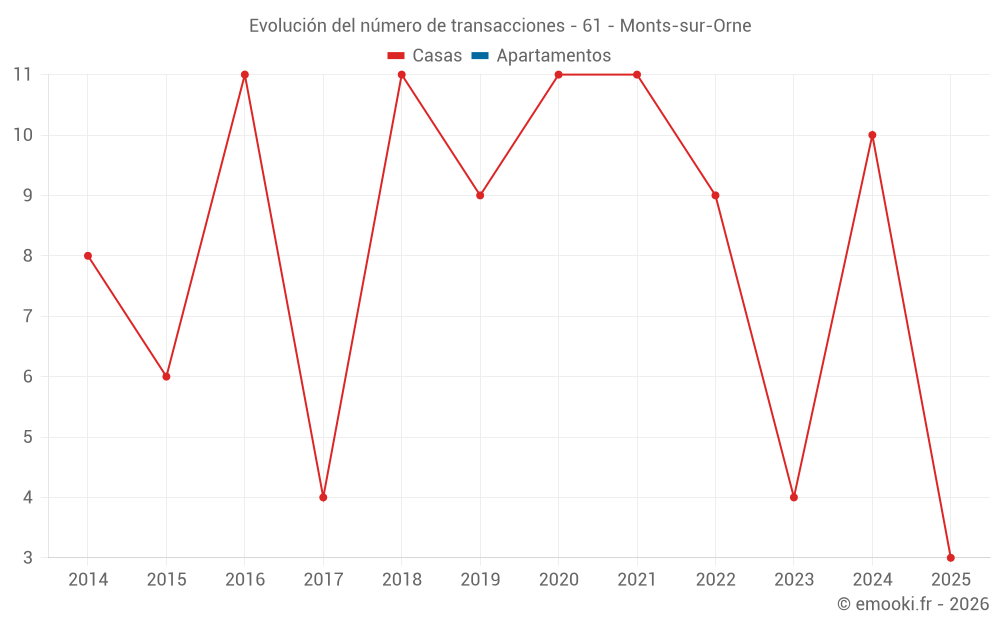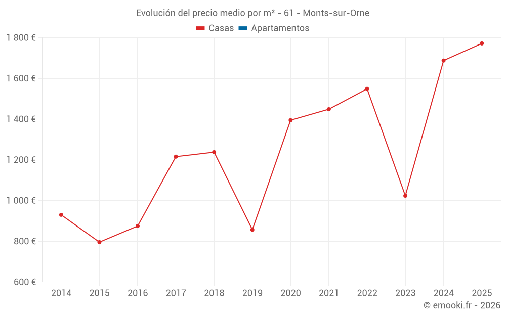El precio mediano en las 15 transacciones de casas de los últimos 24 meses en la comuna de Monts-sur-Orne fue de 1 700 € por metro cuadrado para un valor patrimonial medio de 150 000 €. Durante este período el 60% de las transacciones estuvieron entre 1 214 y 2 079 € por metro cuadrado (del 2º al 8º decil).