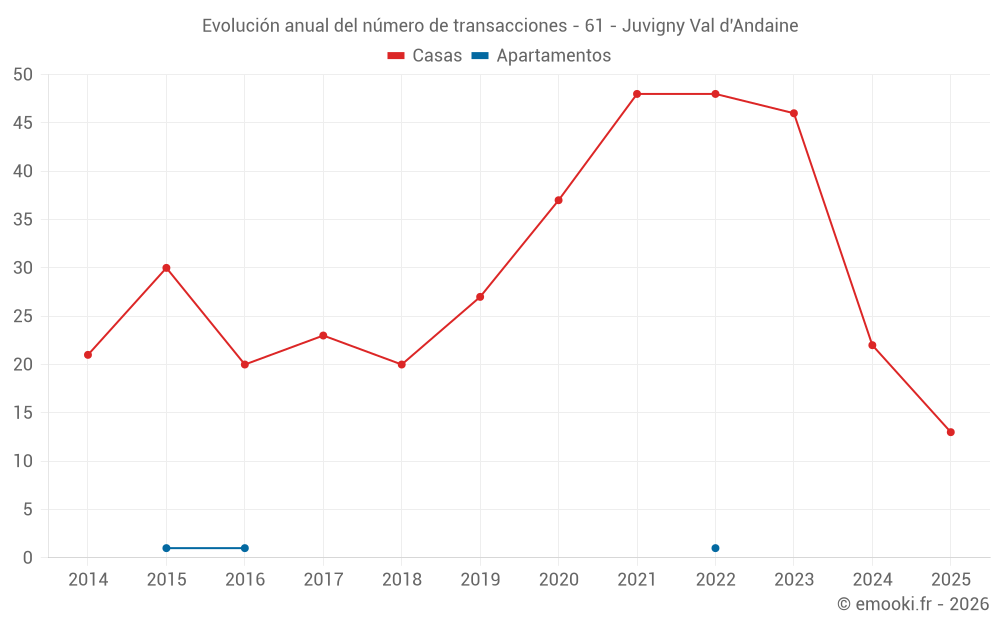 El precio mediano en las 28 transacciones de casas de los últimos 12 meses en la comuna de Juvigny Val d'Andaine fue de 1 224 € por metro cuadrado para un valor patrimonial medio de 86 400 €. Durante este período el 60% de las transacciones estuvieron entre 546 y 1 502 € por metro cuadrado (del 2º al 8º decil).