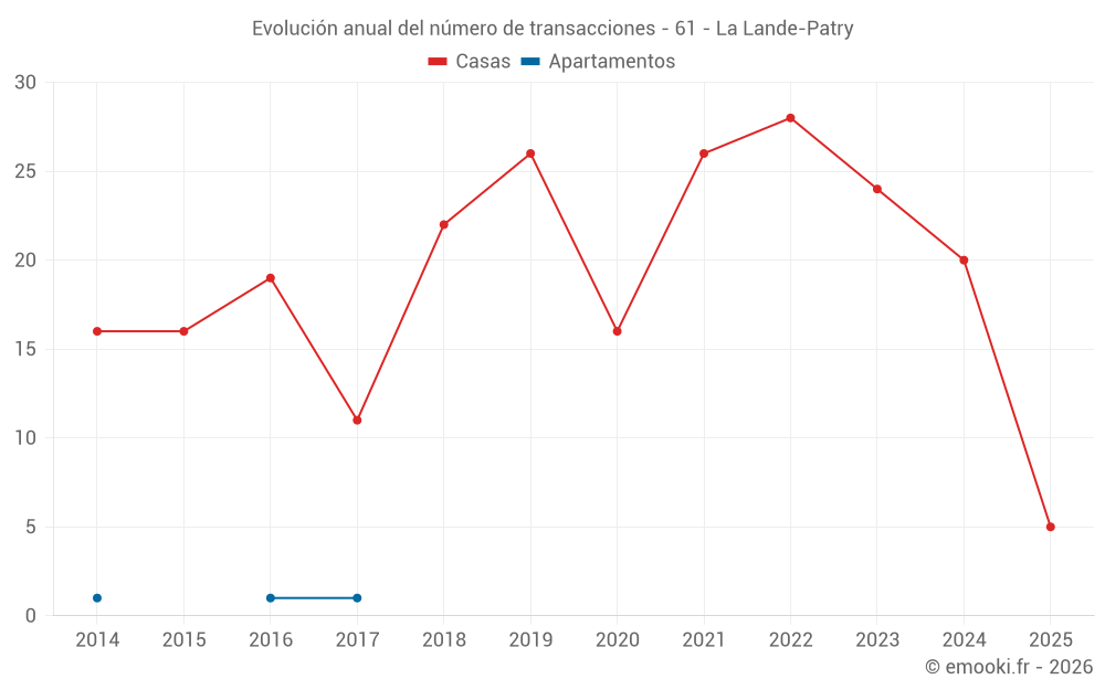 El precio mediano en las 38 transacciones de casas de los últimos 24 meses en la comuna de La Lande-Patry fue de 1 189 € por metro cuadrado para un valor patrimonial medio de 99 300 €. Durante este período el 60% de las transacciones estuvieron entre 848 y 1 621 € por metro cuadrado (del 2º al 8º decil).