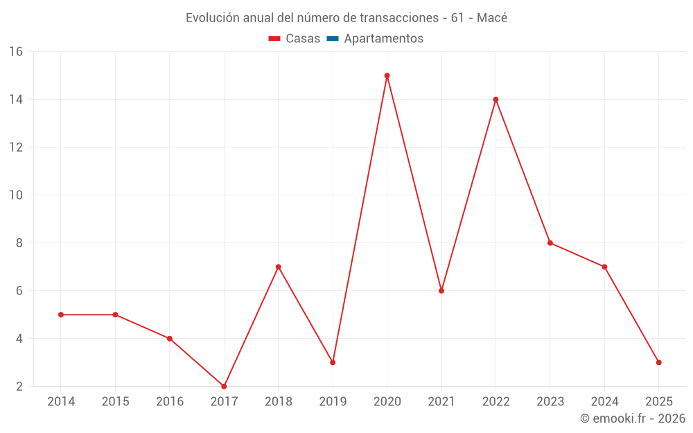El precio mediano en las 16 transacciones de casas de los últimos 24 meses en la comuna de Macé fue de 1 232 € por metro cuadrado para un valor patrimonial medio de 123 400 €. Durante este período el 60% de las transacciones estuvieron entre 896 y 1 577 € por metro cuadrado (del 2º al 8º decil).