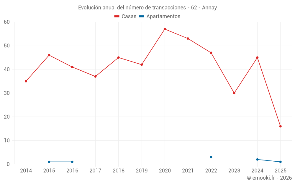 El precio mediano en las 36 transacciones de casas de los últimos 12 meses en la comuna de Annay fue de 1 719 € por metro cuadrado para un valor patrimonial medio de 165 000 €. Durante este período el 60% de las transacciones estuvieron entre 1 390 y 2 460 € por metro cuadrado (del 2º al 8º decil).