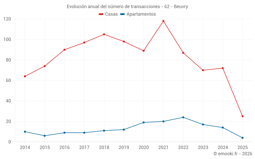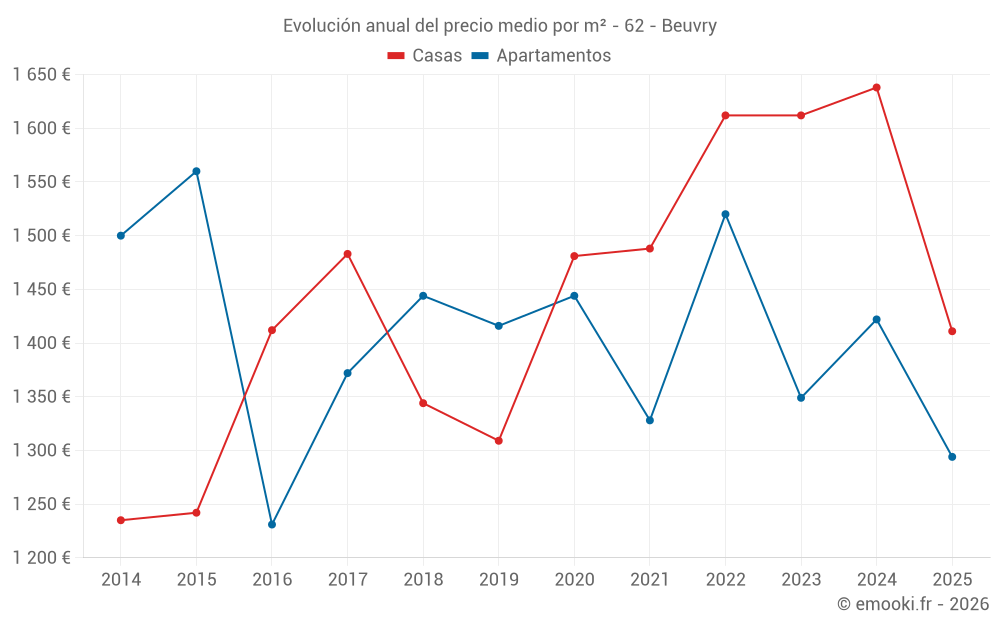 El precio mediano en las 25 transacciones de apartamentos de los últimos 24 meses en la comuna de Beuvry fue de 1 375 € por metro cuadrado para un valor patrimonial medio de 69 000 €. Durante este período el 60% de las transacciones estuvieron entre 1 053 y 1 647 € por metro cuadrado (del 2º al 8º decil).