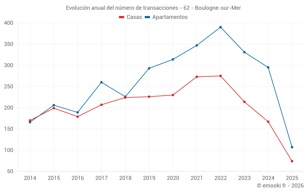 El precio mediano en las 44 transacciones de apartamentos de los últimos 3 meses en la comuna de Boulogne-sur-Mer fue de 1 485 € por metro cuadrado para un valor patrimonial medio de 97 745 €. Durante este período el 60% de las transacciones estuvieron entre 1 064 y 1 865 € por metro cuadrado (del 2º al 8º decil).