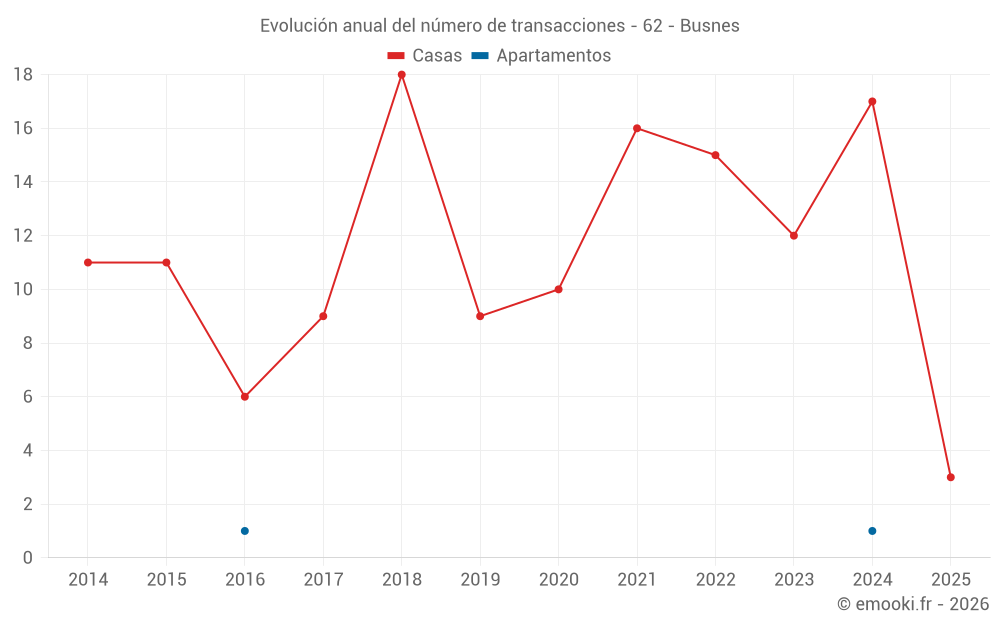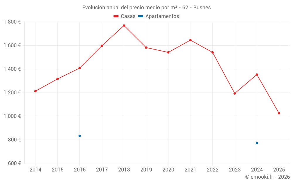 El precio mediano en las 28 transacciones de casas de los últimos 24 meses en la comuna de Busnes fue de 1 230 € por metro cuadrado para un valor patrimonial medio de 144 870 €. Durante este período el 60% de las transacciones estuvieron entre 776 y 1 963 € por metro cuadrado (del 2º al 8º decil).