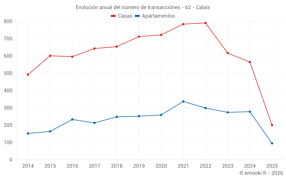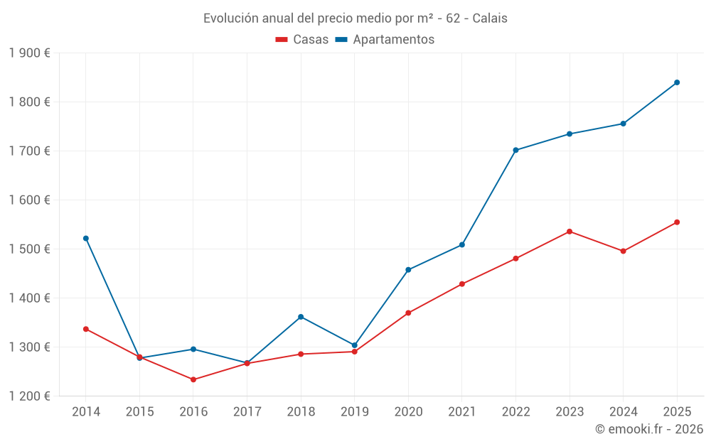 El precio mediano en las 46 transacciones de apartamentos de los últimos 3 meses en la comuna de Calais fue de 1 825 € por metro cuadrado para un valor patrimonial medio de 123 955 €. Durante este período el 60% de las transacciones estuvieron entre 1 237 y 2 304 € por metro cuadrado (del 2º al 8º decil).