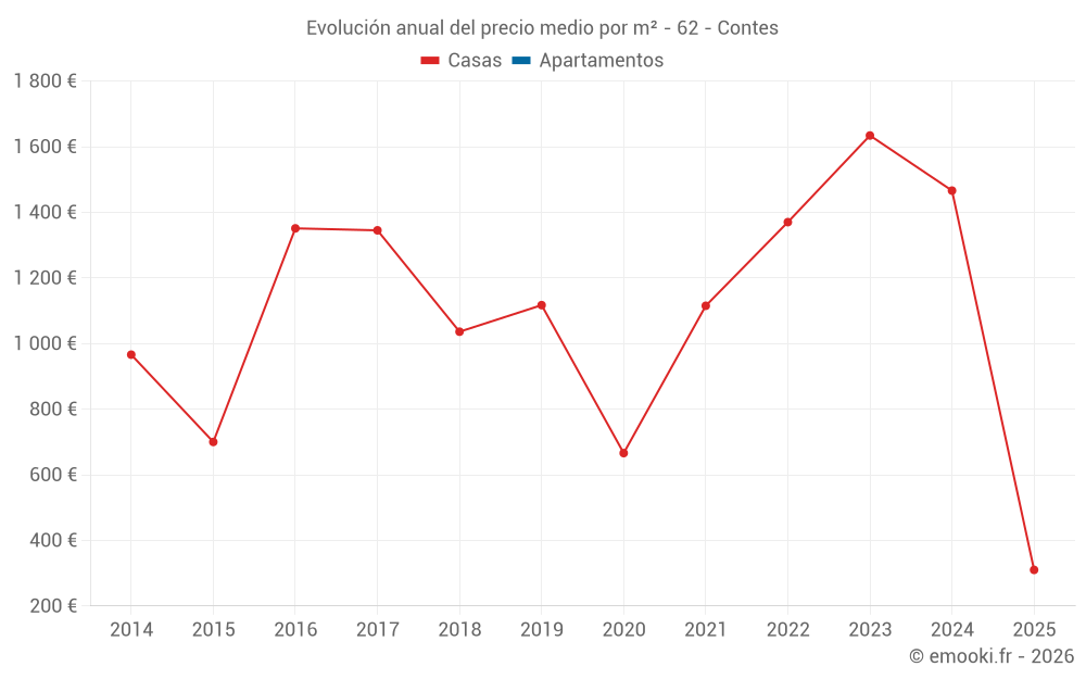 El precio mediano en las 14 transacciones de casas de los últimos 24 meses en la comuna de Contes fue de 1 481 € por metro cuadrado para un valor patrimonial medio de 128 000 €. Durante este período el 60% de las transacciones estuvieron entre 814 y 1 831 € por metro cuadrado (del 2º al 8º decil).