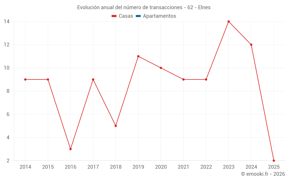 El precio mediano en las 18 transacciones de casas de los últimos 24 meses en la comuna de Elnes fue de 1 424 € por metro cuadrado para un valor patrimonial medio de 123 000 €. Durante este período el 60% de las transacciones estuvieron entre 1 047 y 1 575 € por metro cuadrado (del 2º al 8º decil).