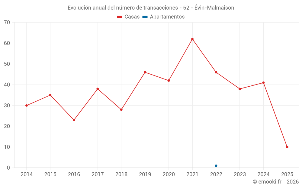 El precio mediano en las 35 transacciones de casas de los últimos 12 meses en la comuna de Évin-Malmaison fue de 1 913 € por metro cuadrado para un valor patrimonial medio de 172 000 €. Durante este período el 60% de las transacciones estuvieron entre 1 585 y 2 430 € por metro cuadrado (del 2º al 8º decil).