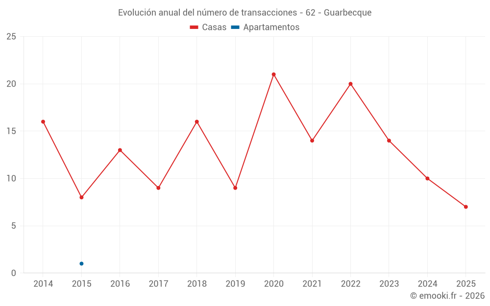 El precio mediano en las 26 transacciones de casas de los últimos 24 meses en la comuna de Guarbecque fue de 1 689 € por metro cuadrado para un valor patrimonial medio de 181 850 €. Durante este período el 60% de las transacciones estuvieron entre 1 137 y 2 354 € por metro cuadrado (del 2º al 8º decil).