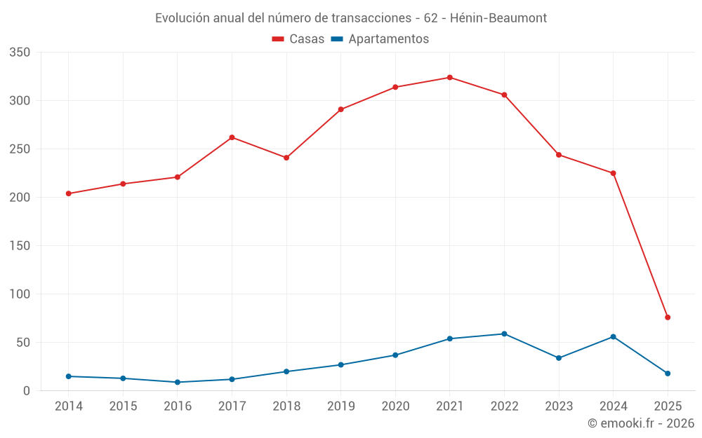 El precio mediano en las 18 transacciones de apartamentos de los últimos 6 meses en la comuna de Hénin-Beaumont fue de 1 440 € por metro cuadrado para un valor patrimonial medio de 70 500 €. Durante este período el 60% de las transacciones estuvieron entre 1 269 y 1 724 € por metro cuadrado (del 2º al 8º decil).