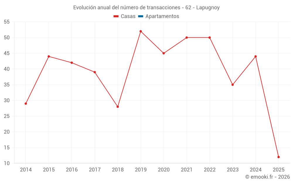 El precio mediano en las 40 transacciones de casas de los últimos 12 meses en la comuna de Lapugnoy fue de 1 612 € por metro cuadrado para un valor patrimonial medio de 145 750 €. Durante este período el 60% de las transacciones estuvieron entre 785 y 2 029 € por metro cuadrado (del 2º al 8º decil).