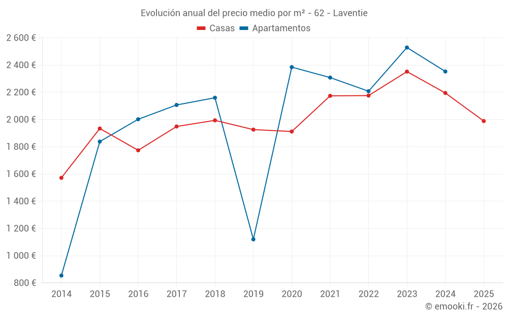 El precio mediano en las 23 transacciones de casas de los últimos 6 meses en la comuna de Laventie fue de 1 989 € por metro cuadrado para un valor patrimonial medio de 219 800 €. Durante este período el 60% de las transacciones estuvieron entre 1 606 y 2 798 € por metro cuadrado (del 2º al 8º decil).