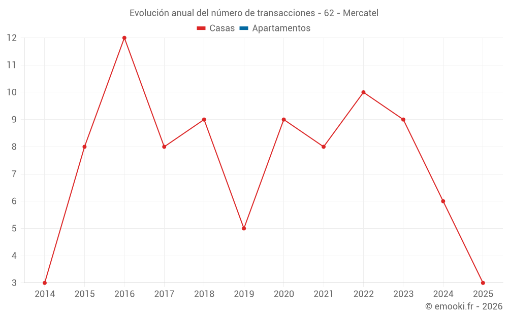 El precio mediano en las 15 transacciones de casas de los últimos 24 meses en la comuna de Mercatel fue de 1 880 € por metro cuadrado para un valor patrimonial medio de 219 500 €. Durante este período el 60% de las transacciones estuvieron entre 1 013 y 2 558 € por metro cuadrado (del 2º al 8º decil).