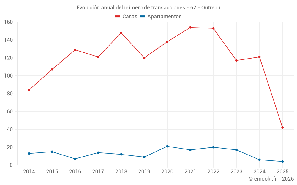 El precio mediano en las 42 transacciones de casas de los últimos 6 meses en la comuna de Outreau fue de 1 812 € por metro cuadrado para un valor patrimonial medio de 152 000 €. Durante este período el 60% de las transacciones estuvieron entre 1 306 y 2 089 € por metro cuadrado (del 2º al 8º decil).