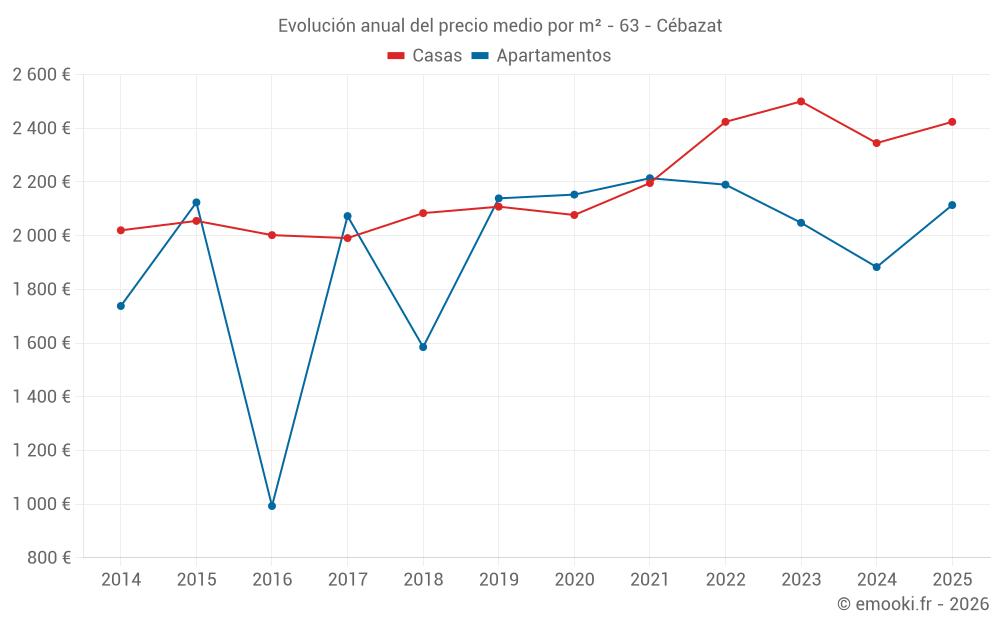 El precio mediano en las 22 transacciones de apartamentos de los últimos 24 meses en la comuna de Cébazat fue de 2 048 € por metro cuadrado para un valor patrimonial medio de 125 600 €. Durante este período el 60% de las transacciones estuvieron entre 1 695 y 2 548 € por metro cuadrado (del 2º al 8º decil).