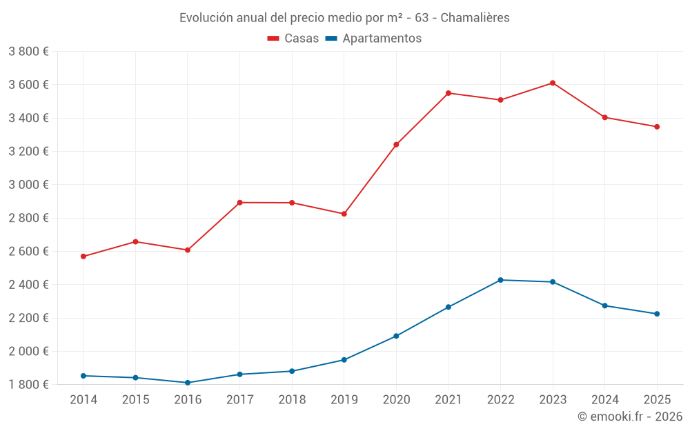 El precio mediano en las 63 transacciones de apartamentos de los últimos 3 meses en la comuna de Chamalières fue de 2 340 € por metro cuadrado para un valor patrimonial medio de 161 000 €. Durante este período el 60% de las transacciones estuvieron entre 1 803 y 2 879 € por metro cuadrado (del 2º al 8º decil).