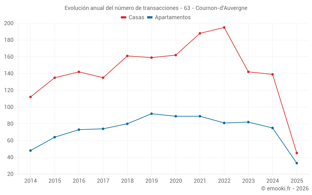 El precio mediano en las 33 transacciones de apartamentos de los últimos 6 meses en la comuna de Cournon-d'Auvergne fue de 2 143 € por metro cuadrado para un valor patrimonial medio de 131 000 €. Durante este período el 60% de las transacciones estuvieron entre 1 488 y 2 568 € por metro cuadrado (del 2º al 8º decil).