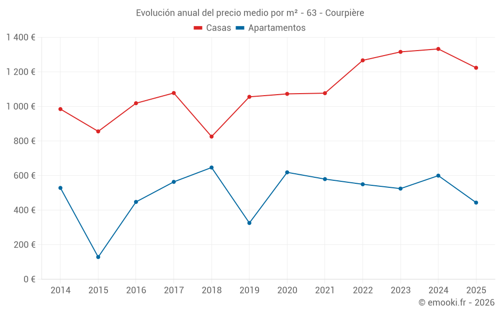 El precio mediano en las 16 transacciones de apartamentos de los últimos 24 meses en la comuna de Courpière fue de 546 € por metro cuadrado para un valor patrimonial medio de 53 500 €. Durante este período el 60% de las transacciones estuvieron entre 440 y 784 € por metro cuadrado (del 2º al 8º decil).