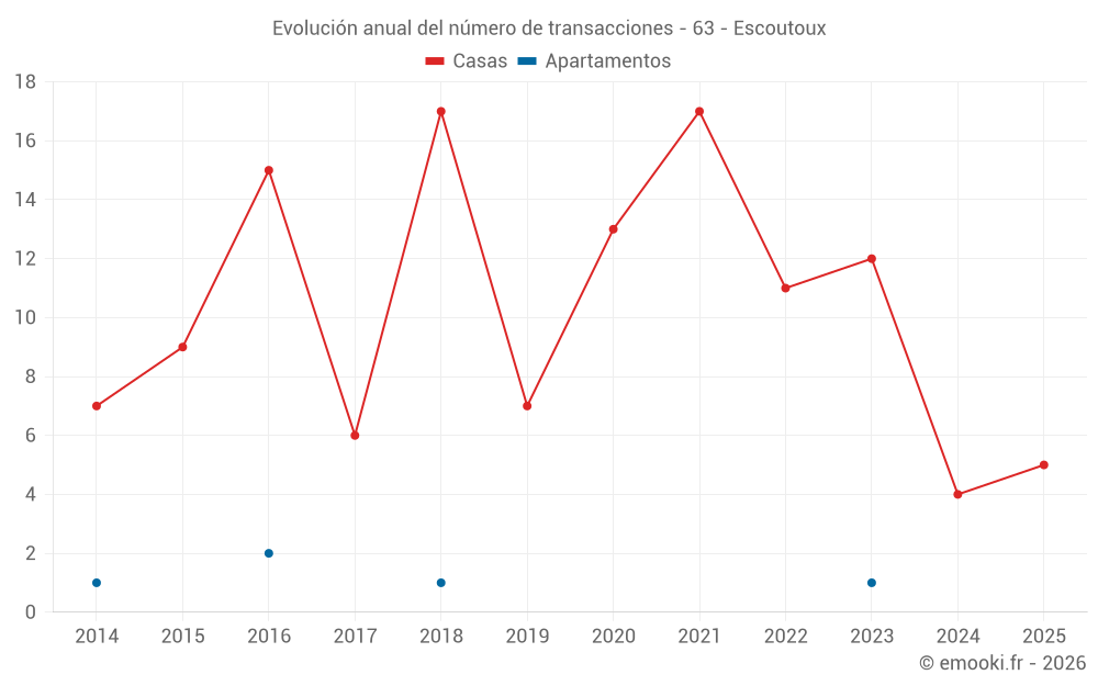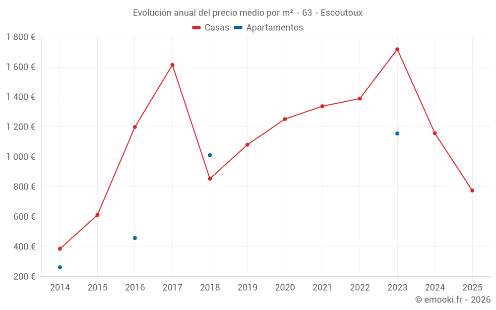 El precio mediano en las 16 transacciones de casas de los últimos 24 meses en la comuna de Escoutoux fue de 1 144 € por metro cuadrado para un valor patrimonial medio de 107 500 €. Durante este período el 60% de las transacciones estuvieron entre 775 y 1 741 € por metro cuadrado (del 2º al 8º decil).