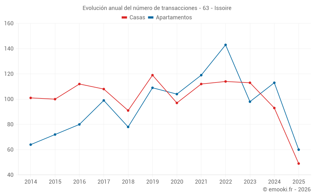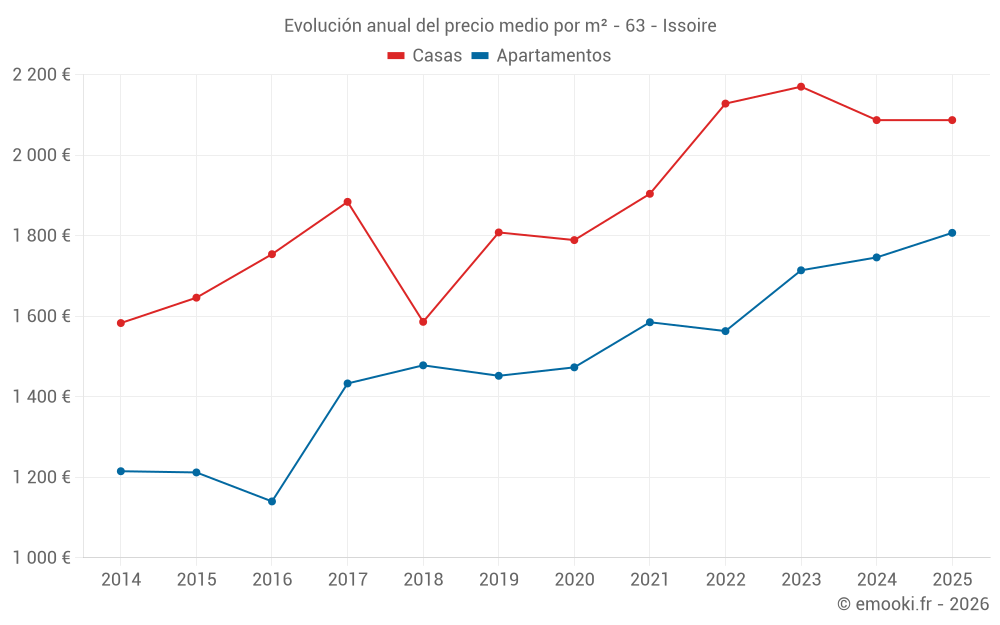 El precio mediano en las 21 transacciones de apartamentos de los últimos 3 meses en la comuna de Issoire fue de 1 750 € por metro cuadrado para un valor patrimonial medio de 100 000 €. Durante este período el 60% de las transacciones estuvieron entre 1 308 y 2 499 € por metro cuadrado (del 2º al 8º decil).