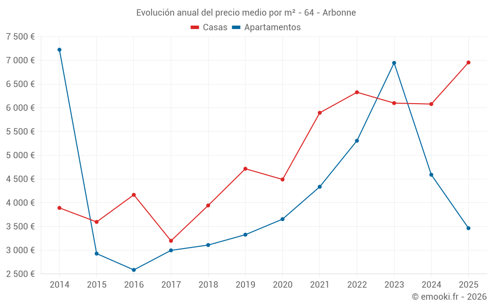 El precio mediano en las 16 transacciones de apartamentos de los últimos 24 meses en la comuna de Arbonne fue de 4 591 € por metro cuadrado para un valor patrimonial medio de 274 500 €. Durante este período el 60% de las transacciones estuvieron entre 3 917 y 7 200 € por metro cuadrado (del 2º al 8º decil).