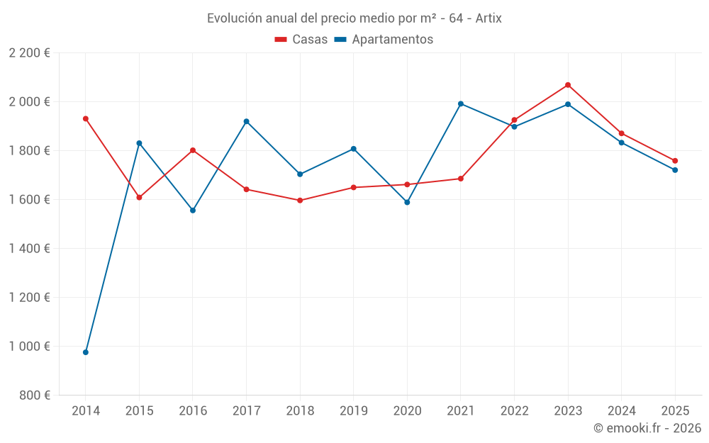 El precio mediano en las 21 transacciones de casas de los últimos 12 meses en la comuna de Artix fue de 1 759 € por metro cuadrado para un valor patrimonial medio de 162 750 €. Durante este período el 60% de las transacciones estuvieron entre 1 433 y 2 174 € por metro cuadrado (del 2º al 8º decil).
