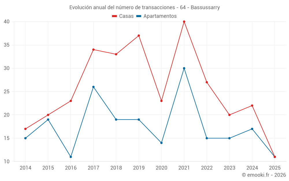 El precio mediano en las 19 transacciones de apartamentos de los últimos 12 meses en la comuna de Bassussarry fue de 4 674 € por metro cuadrado para un valor patrimonial medio de 217 000 €. Durante este período el 60% de las transacciones estuvieron entre 4 390 y 5 202 € por metro cuadrado (del 2º al 8º decil).