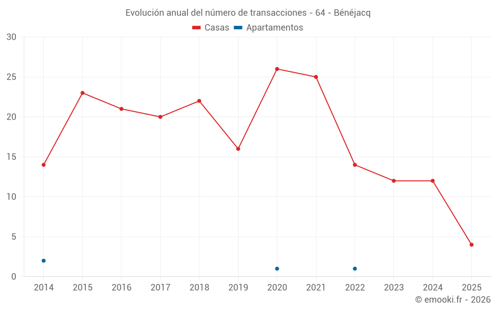El precio mediano en las 23 transacciones de casas de los últimos 24 meses en la comuna de Bénéjacq fue de 2 147 € por metro cuadrado para un valor patrimonial medio de 218 500 €. Durante este período el 60% de las transacciones estuvieron entre 1 625 y 2 390 € por metro cuadrado (del 2º al 8º decil).
