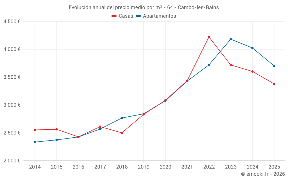 El precio mediano en las 26 transacciones de apartamentos de los últimos 6 meses en la comuna de Cambo-les-Bains fue de 3 702 € por metro cuadrado para un valor patrimonial medio de 186 500 €. Durante este período el 60% de las transacciones estuvieron entre 2 647 y 4 465 € por metro cuadrado (del 2º al 8º decil).