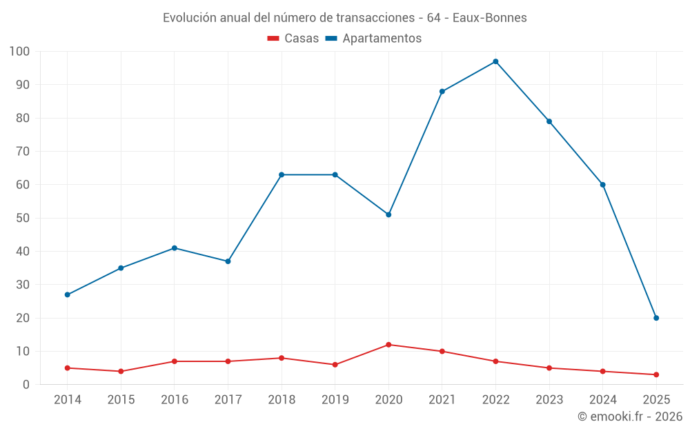 El precio mediano en las 20 transacciones de apartamentos de los últimos 6 meses en la comuna de Eaux-Bonnes fue de 1 789 € por metro cuadrado para un valor patrimonial medio de 49 700 €. Durante este período el 60% de las transacciones estuvieron entre 1 240 y 2 134 € por metro cuadrado (del 2º al 8º decil).