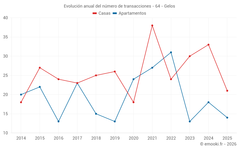 El precio mediano en las 21 transacciones de casas de los últimos 6 meses en la comuna de Gelos fue de 2 580 € por metro cuadrado para un valor patrimonial medio de 270 000 €. Durante este período el 60% de las transacciones estuvieron entre 1 895 y 3 456 € por metro cuadrado (del 2º al 8º decil).