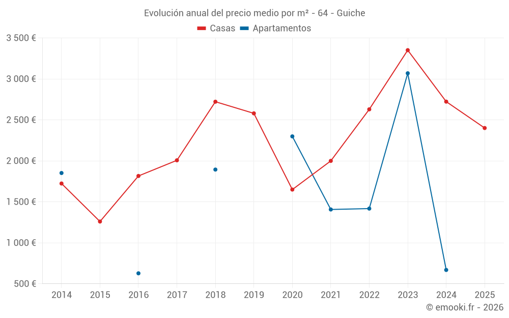 El precio mediano en las 15 transacciones de casas de los últimos 24 meses en la comuna de Guiche fue de 2 708 € por metro cuadrado para un valor patrimonial medio de 311 094 €. Durante este período el 60% de las transacciones estuvieron entre 1 619 y 3 396 € por metro cuadrado (del 2º al 8º decil).