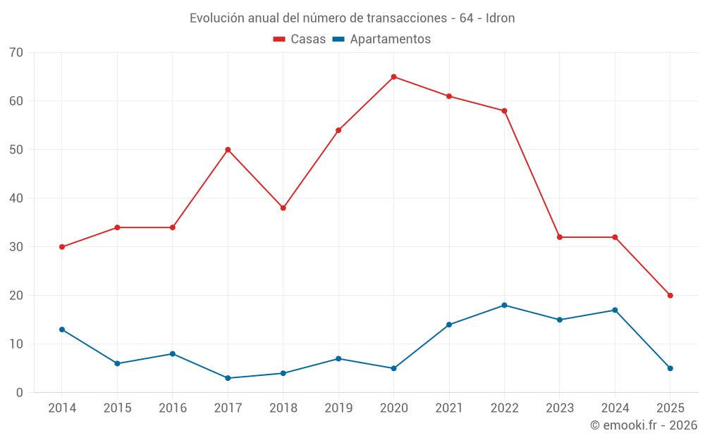 El precio mediano en las 20 transacciones de casas de los últimos 6 meses en la comuna de Idron fue de 2 831 € por metro cuadrado para un valor patrimonial medio de 357 250 €. Durante este período el 60% de las transacciones estuvieron entre 2 062 y 3 440 € por metro cuadrado (del 2º al 8º decil).