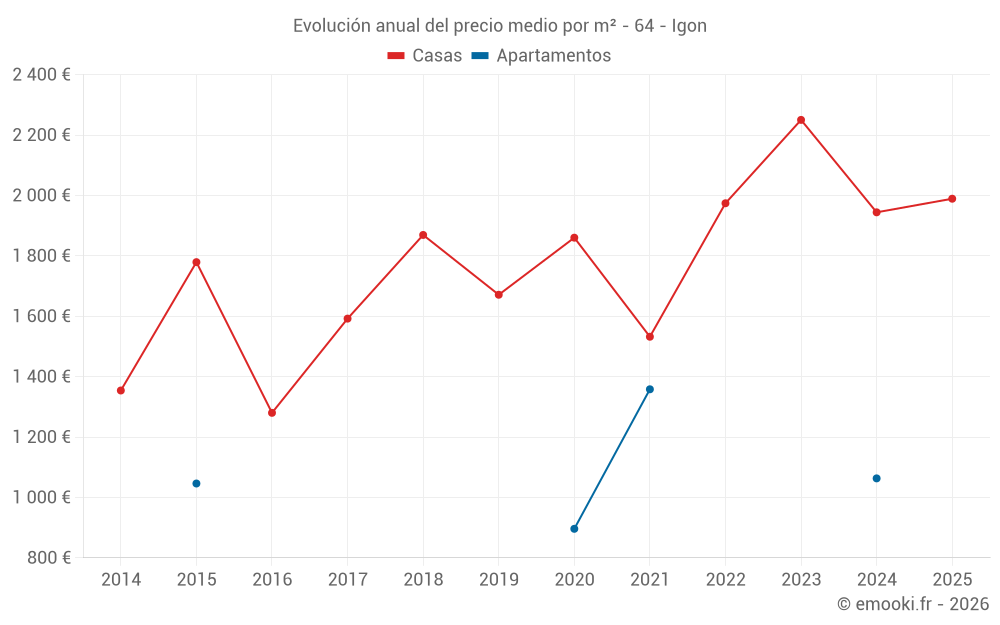 El precio mediano en las 16 transacciones de casas de los últimos 24 meses en la comuna de Igon fue de 2 010 € por metro cuadrado para un valor patrimonial medio de 200 650 €. Durante este período el 60% de las transacciones estuvieron entre 1 563 y 2 588 € por metro cuadrado (del 2º al 8º decil).
