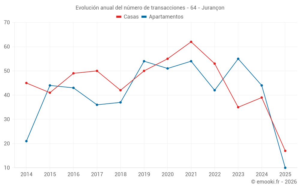 El precio mediano en las 37 transacciones de apartamentos de los últimos 12 meses en la comuna de Jurançon fue de 1 550 € por metro cuadrado para un valor patrimonial medio de 100 000 €. Durante este período el 60% de las transacciones estuvieron entre 1 205 y 2 044 € por metro cuadrado (del 2º al 8º decil).