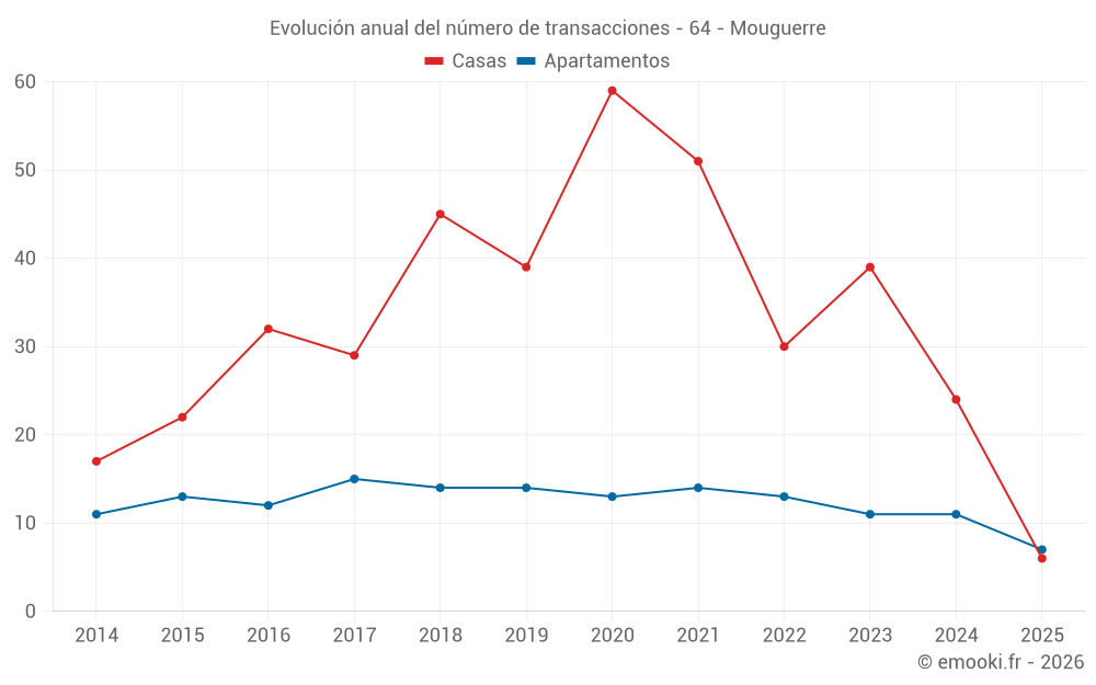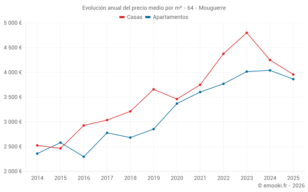 El precio mediano en las 23 transacciones de apartamentos de los últimos 24 meses en la comuna de Mouguerre fue de 3 950 € por metro cuadrado para un valor patrimonial medio de 271 600 €. Durante este período el 60% de las transacciones estuvieron entre 3 190 y 4 445 € por metro cuadrado (del 2º al 8º decil).