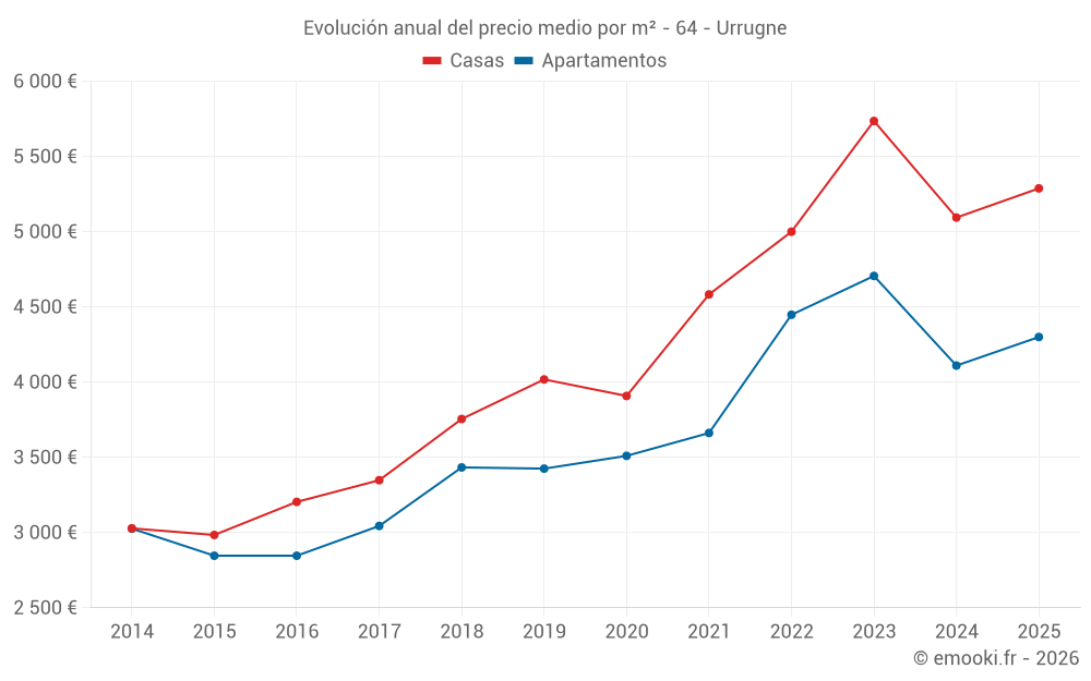 El precio mediano en las 22 transacciones de casas de los últimos 6 meses en la comuna de Urrugne fue de 5 288 € por metro cuadrado para un valor patrimonial medio de 592 500 €. Durante este período el 60% de las transacciones estuvieron entre 4 370 y 8 090 € por metro cuadrado (del 2º al 8º decil).