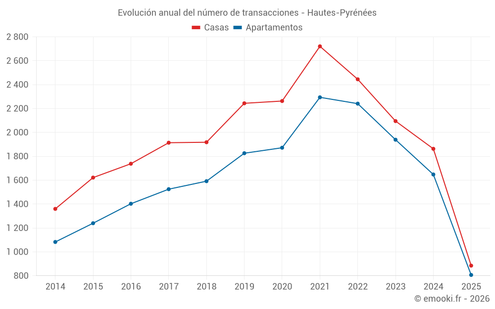 El precio mediano en las 449 transacciones de casas de los últimos 3 meses en el departamento de Hautes-Pyrénées fue de 1 695 € por metro cuadrado para un valor patrimonial medio de 165 500 €. Durante este período el 60% de las transacciones estuvieron entre 1 020 y 2 317 € por metro cuadrado (del 2º al 8º decil).