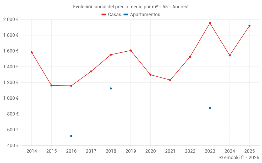 El precio mediano en las 18 transacciones de casas de los últimos 12 meses en la comuna de Andrest fue de 1 728 € por metro cuadrado para un valor patrimonial medio de 187 500 €. Durante este período el 60% de las transacciones estuvieron entre 1 486 y 2 079 € por metro cuadrado (del 2º al 8º decil).