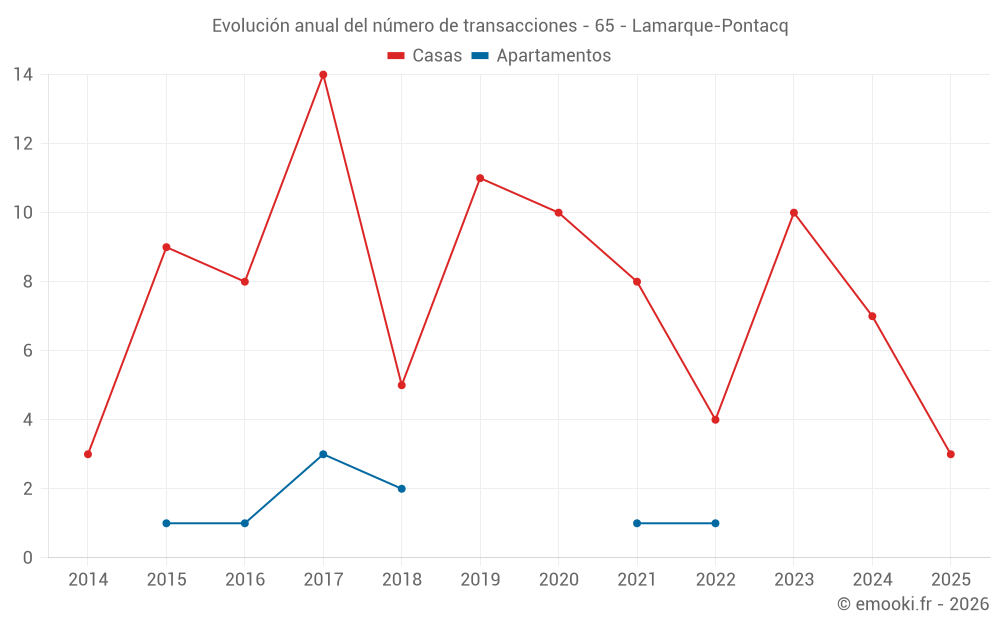 El precio mediano en las 14 transacciones de casas de los últimos 24 meses en la comuna de Lamarque-Pontacq fue de 1 876 € por metro cuadrado para un valor patrimonial medio de 216 000 €. Durante este período el 60% de las transacciones estuvieron entre 1 386 y 2 403 € por metro cuadrado (del 2º al 8º decil).