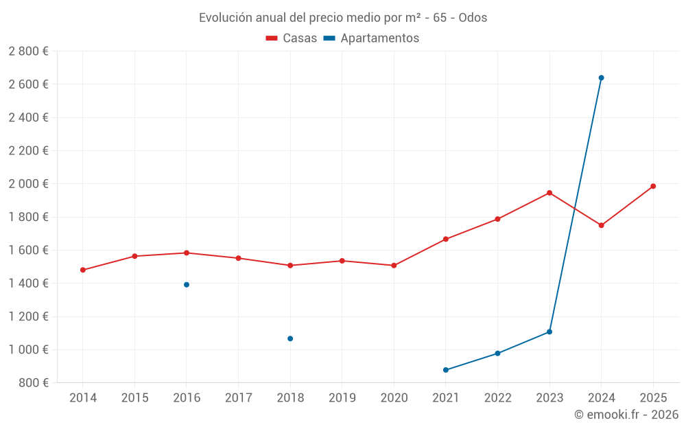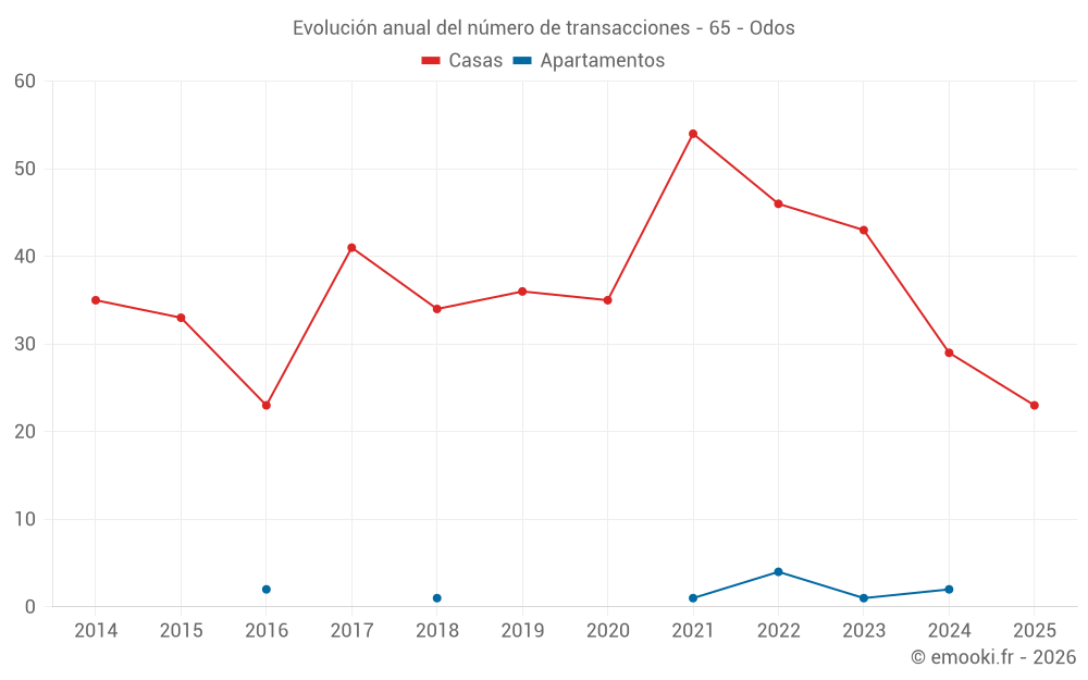 El precio mediano en las 23 transacciones de casas de los últimos 6 meses en la comuna de Odos fue de 1 986 € por metro cuadrado para un valor patrimonial medio de 206 000 €. Durante este período el 60% de las transacciones estuvieron entre 1 483 y 2 386 € por metro cuadrado (del 2º al 8º decil).