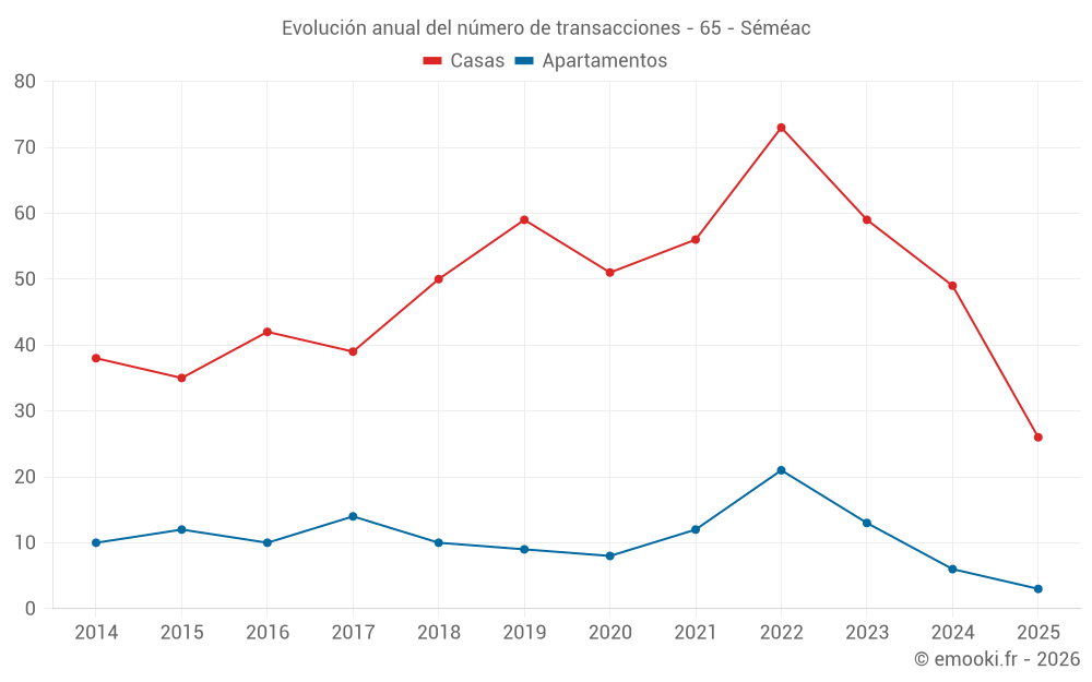 El precio mediano en las 26 transacciones de casas de los últimos 6 meses en la comuna de Séméac fue de 1 926 € por metro cuadrado para un valor patrimonial medio de 161 925 €. Durante este período el 60% de las transacciones estuvieron entre 1 236 y 2 287 € por metro cuadrado (del 2º al 8º decil).