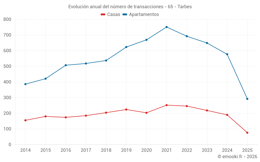 El precio mediano en las 146 transacciones de apartamentos de los últimos 3 meses en la comuna de Tarbes fue de 1 350 € por metro cuadrado para un valor patrimonial medio de 82 500 €. Durante este período el 60% de las transacciones estuvieron entre 985 y 1 765 € por metro cuadrado (del 2º al 8º decil).