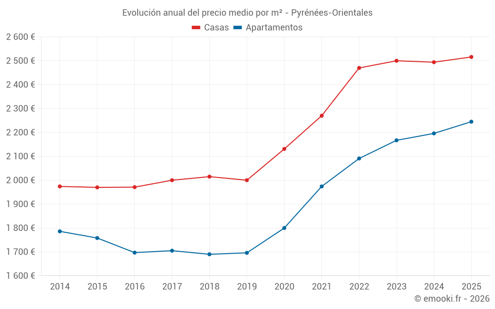 El precio mediano en las 1355 transacciones de apartamentos de los últimos 3 meses en el departamento de Pyrénées-Orientales fue de 2 340 € por metro cuadrado para un valor patrimonial medio de 105 000 €. Durante este período el 60% de las transacciones estuvieron entre 1 358 y 3 700 € por metro cuadrado (del 2º al 8º decil).