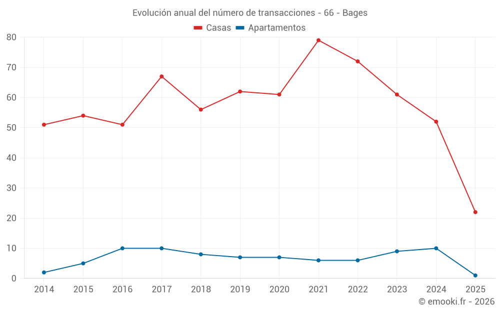 El precio mediano en las 22 transacciones de casas de los últimos 6 meses en la comuna de Bages fue de 2 228 € por metro cuadrado para un valor patrimonial medio de 221 750 €. Durante este período el 60% de las transacciones estuvieron entre 1 768 y 2 947 € por metro cuadrado (del 2º al 8º decil).