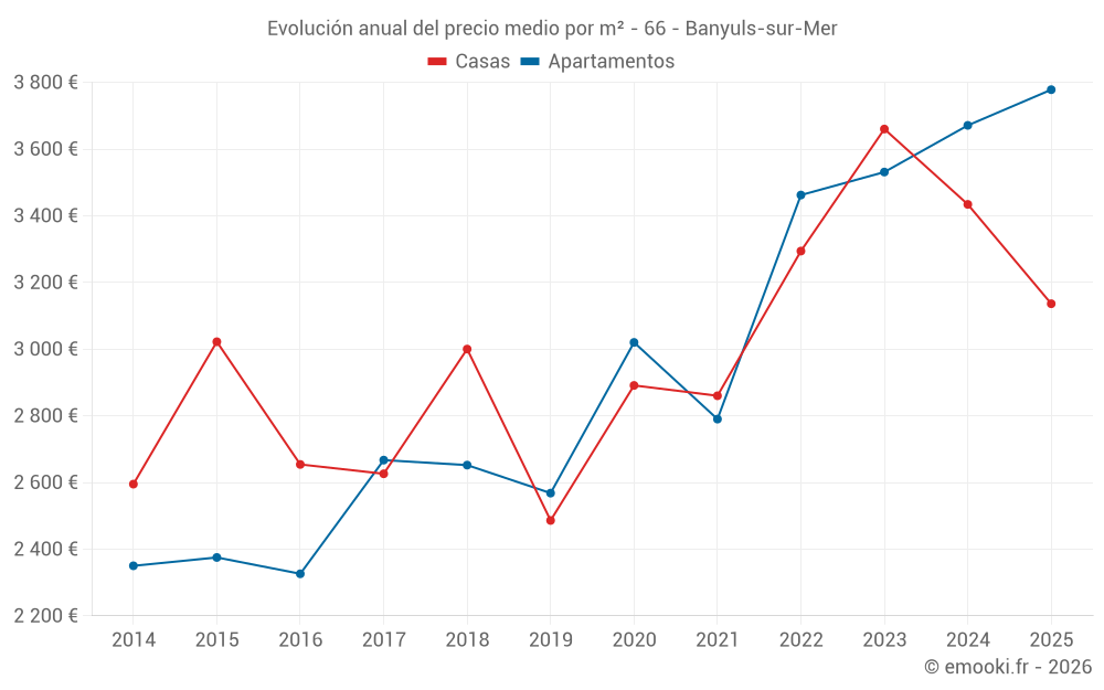 El precio mediano en las 37 transacciones de apartamentos de los últimos 6 meses en la comuna de Banyuls-sur-Mer fue de 3 778 € por metro cuadrado para un valor patrimonial medio de 188 000 €. Durante este período el 60% de las transacciones estuvieron entre 2 809 y 4 547 € por metro cuadrado (del 2º al 8º decil).