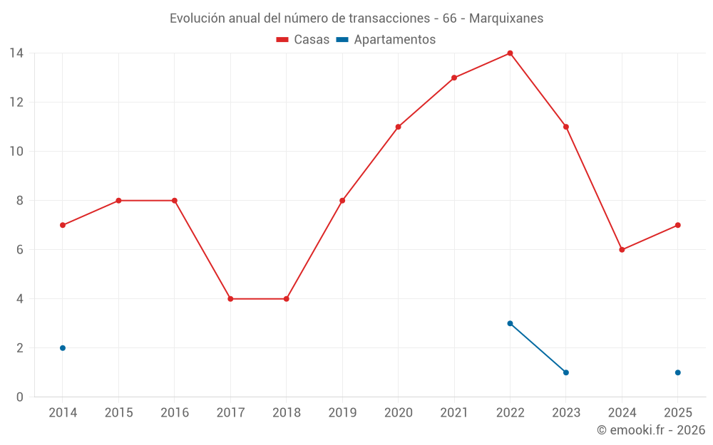 El precio mediano en las 17 transacciones de casas de los últimos 24 meses en la comuna de Marquixanes fue de 1 585 € por metro cuadrado para un valor patrimonial medio de 120 000 €. Durante este período el 60% de las transacciones estuvieron entre 836 y 2 270 € por metro cuadrado (del 2º al 8º decil).