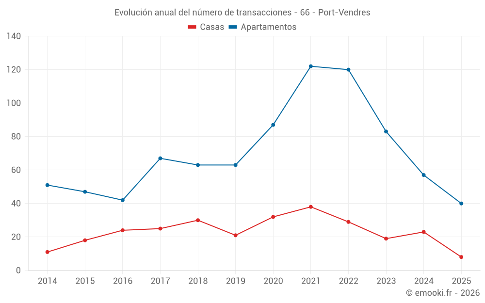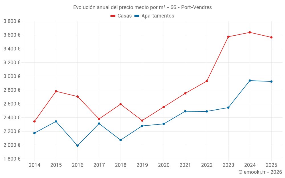 El precio mediano en las 22 transacciones de apartamentos de los últimos 3 meses en la comuna de Port-Vendres fue de 2 946 € por metro cuadrado para un valor patrimonial medio de 185 500 €. Durante este período el 60% de las transacciones estuvieron entre 2 478 y 3 866 € por metro cuadrado (del 2º al 8º decil).